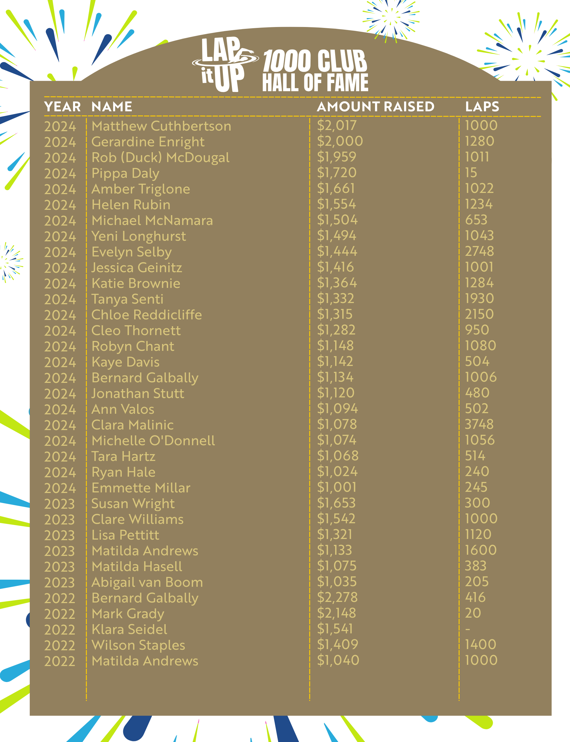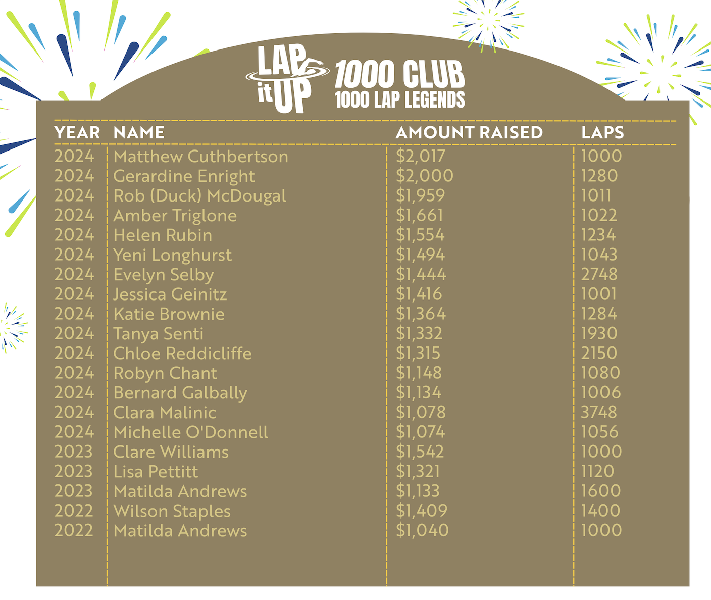 Just like your local swimming club honour board, this is where legends live on. These swimmers have cracked the $1,000 fundraising milestone, earning their place in our Hall of Fame — and showing that every lap really does count.